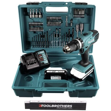 Der HP 457 ist ein 18 Volt Akku betriebener Schlagbohrschrauber von Makita mit einem staubgeschützten 2 Gang Planetengetriebe ausgestattet, wodurch mit 16 Drehmomentstufen und einer Bohrstufe gearbeitet werden kann. Der rutschfeste Handgriff mit eingelegtem Gummipolster sorgt für komfortables und sicheres Arbeiten und durch die starke Motorbremse garantiert der HP 457 exakte Schrauberarbeiten. Der Schlagbohrschrauber eignet sich diesbezüglich hervorragend zum Bohren, Schrauben und Schlagbohren. Geliefert wird der HP 457 Schlagbohrschrauber in einem Transportkoffer mit 74 tlg. Zubehör, zwei BL 1815G 18 Volt 1,5 Ah Akkus sowie dem DC 18 WA Ladegerät. Die G-Serie der Akkus, erkennbar am weißen oberen Rand des Akkugehäuses, ist nicht kompatibel mit der XPT 18 Volt Serie von Makita.