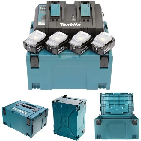 - Set besteht aus 4 18V-Akkus BL1850B, 1 Doppelschnellladegerät DC18RD und 1 MAKPAC Gr. 3